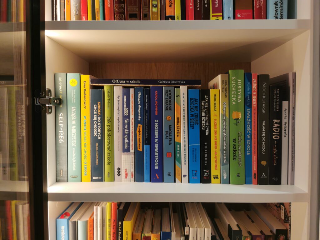 Spojrzałam na półkę z książkami i pomyślałam, że nie stoją na niej podręczniki akademickie. Są za to publikacje, które pozwoliły mi zmienić spojrzenie na edukację i uwierzyć, że można inaczej: oceniać, prowadzić lekcje, tworzyć relacje, wspierać, rozmawiać czy dbać o siebie. Świat się zmienia. Szkoła się zmienia. Uczniowie się zmieniają, więc dlaczego nauczyciele mieliby stać w miejscu?