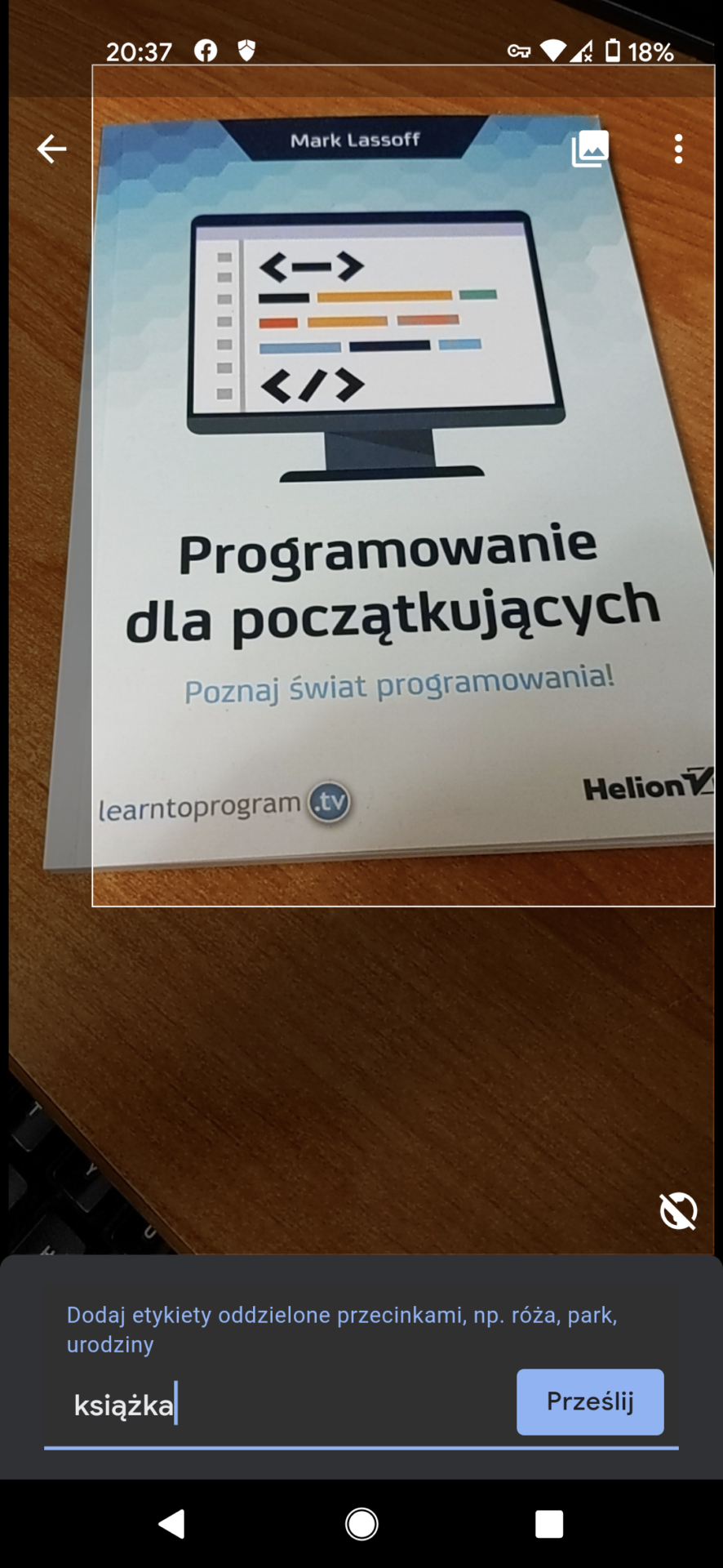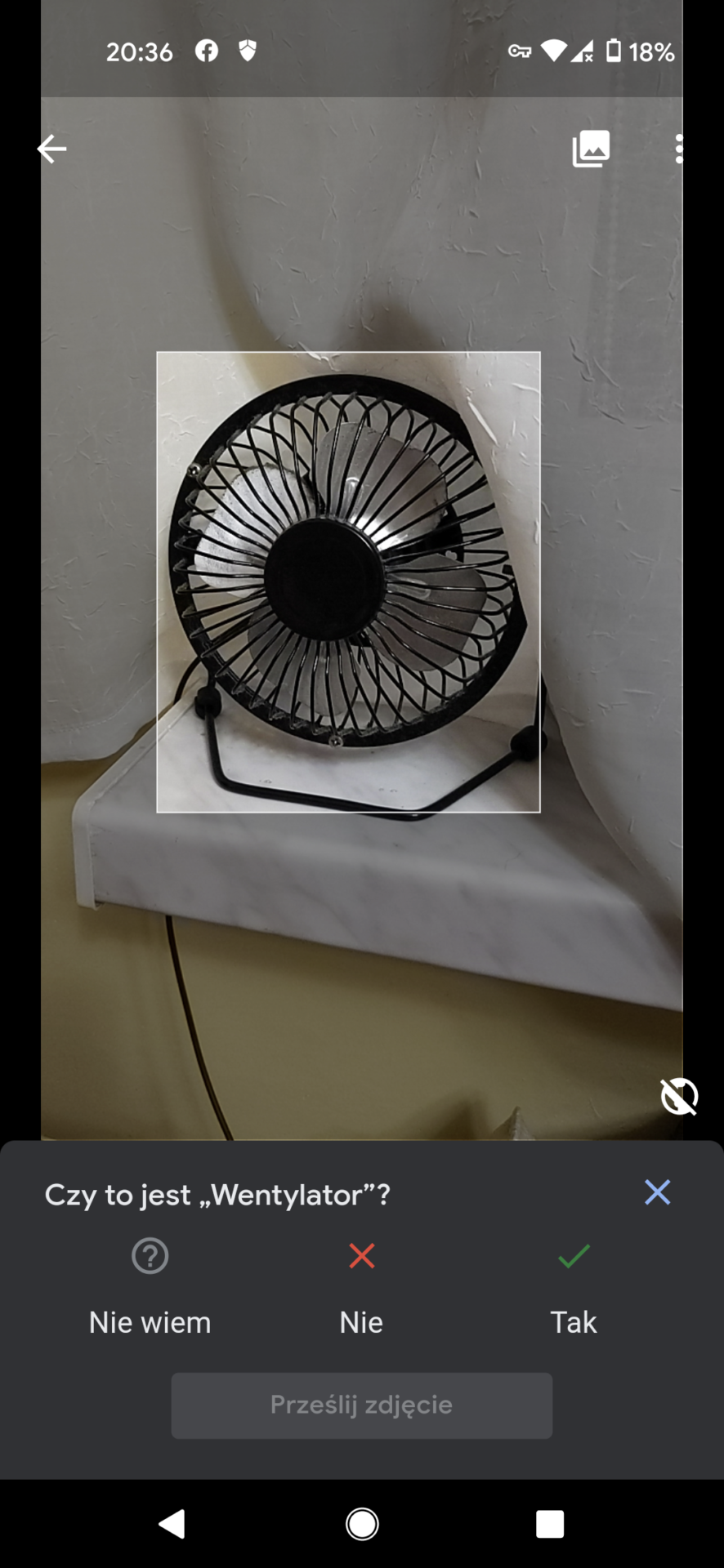 Następnie najprościej na początek wybrać aktywność „Inteligentny aparat”. Celujesz w wybrany kadr (zacznij od prostych obiektów wokół Ciebie – stół, lampa, drzwi, łóżko), Google zaznacza ramką obiekt. Klikasz w obiekt i sprawdzasz, czy Google poprawnie go rozpoznał, jeśli nie – poprawiasz etykietę tekstową (według własnego uznania). Zadania można wykonywać w języku polskim, lub wybranym obcym języku.
