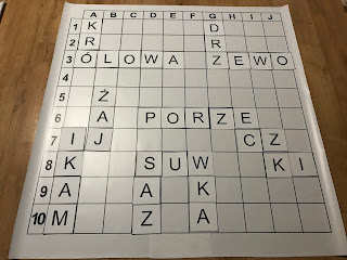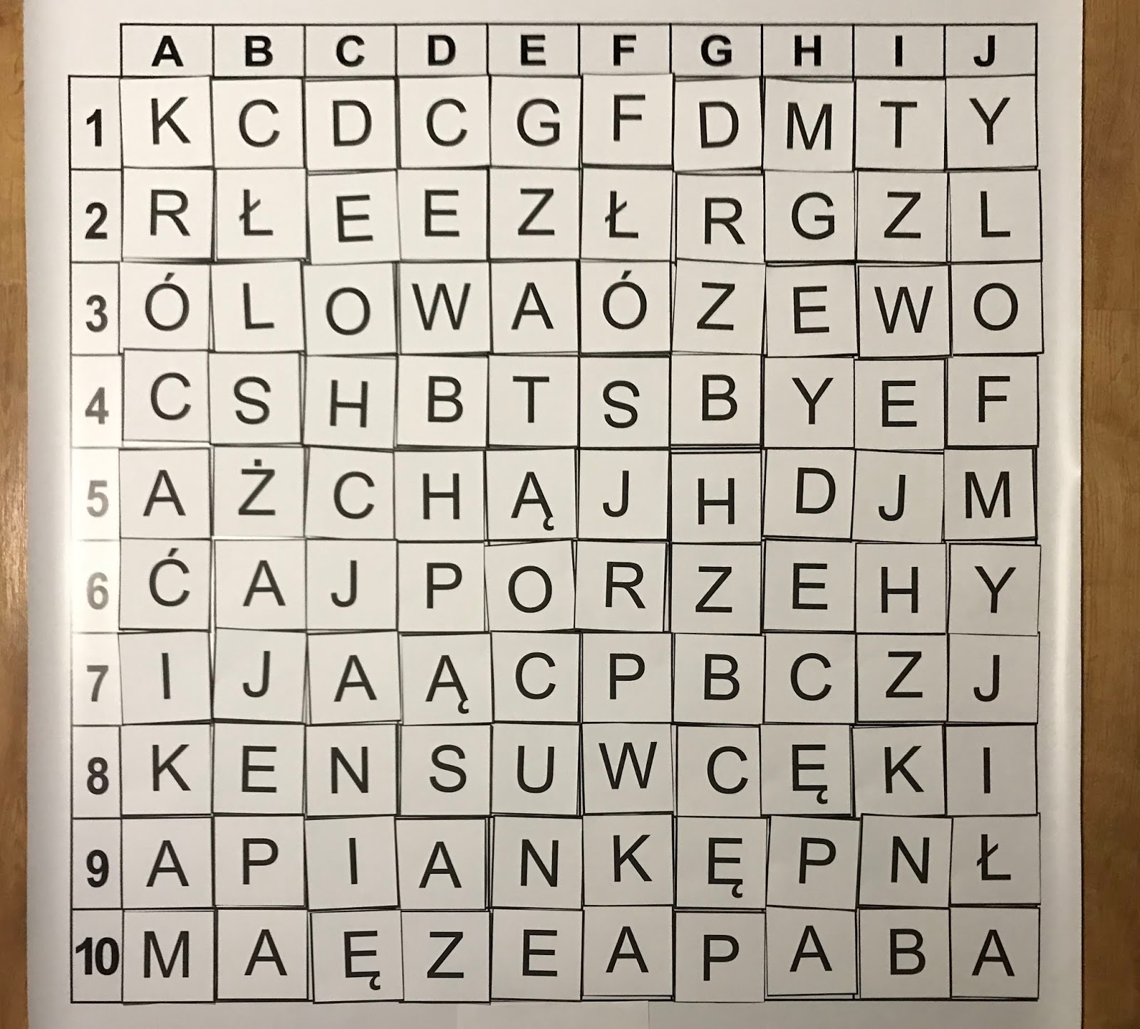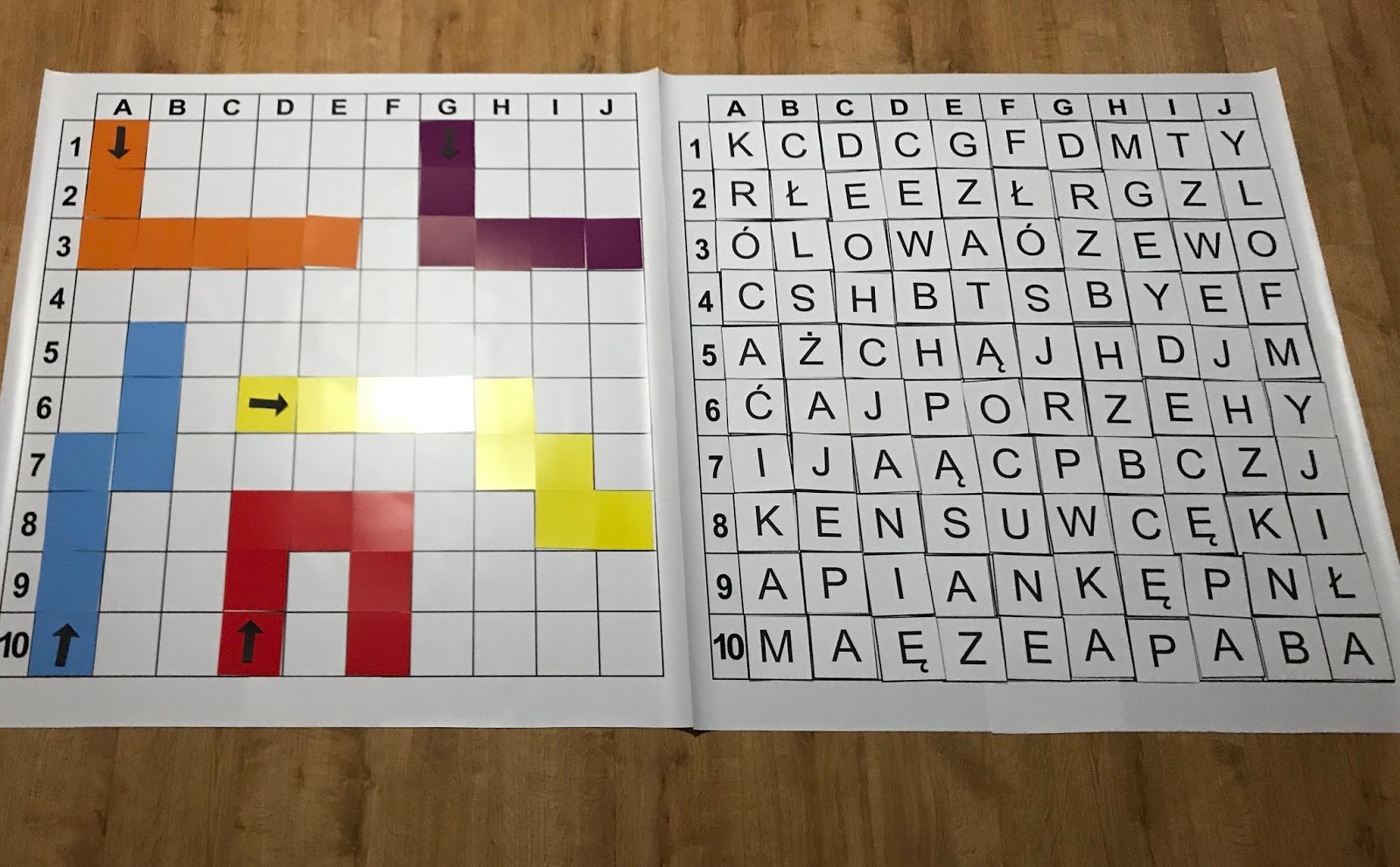 6.Ćwiczenie możemy wykonać w odwrotny sposób. Układamy wyrazy na macie, a uczniowie kodują ich układ za pomocą klocków i współrzędnych.