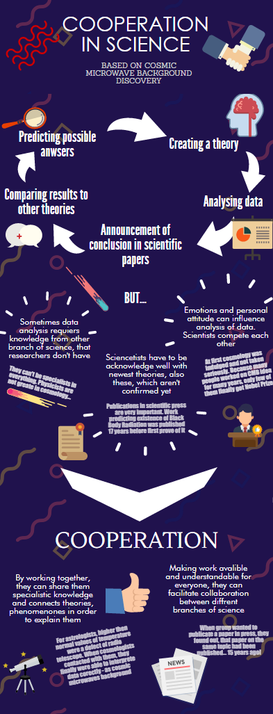 Znalazłam stronę The story behind the science, która w nieco dłuższych tekstach opisuje wynalazki z dziedziny biologii, chemii, fizyki, astronomii czy geologii. Poprosiłam uczniów, aby wybrali jeden tekst na temat ciekawiącego ich odkrycia, przeczytali go i zastanowili się co mówi on o naukach ścisłych i naukowcach, a następnie podsumowali swoje przemyślenia w postaci infografiki i wstawili je jako komentarz do zadania na naszej grupie na Facebooku.