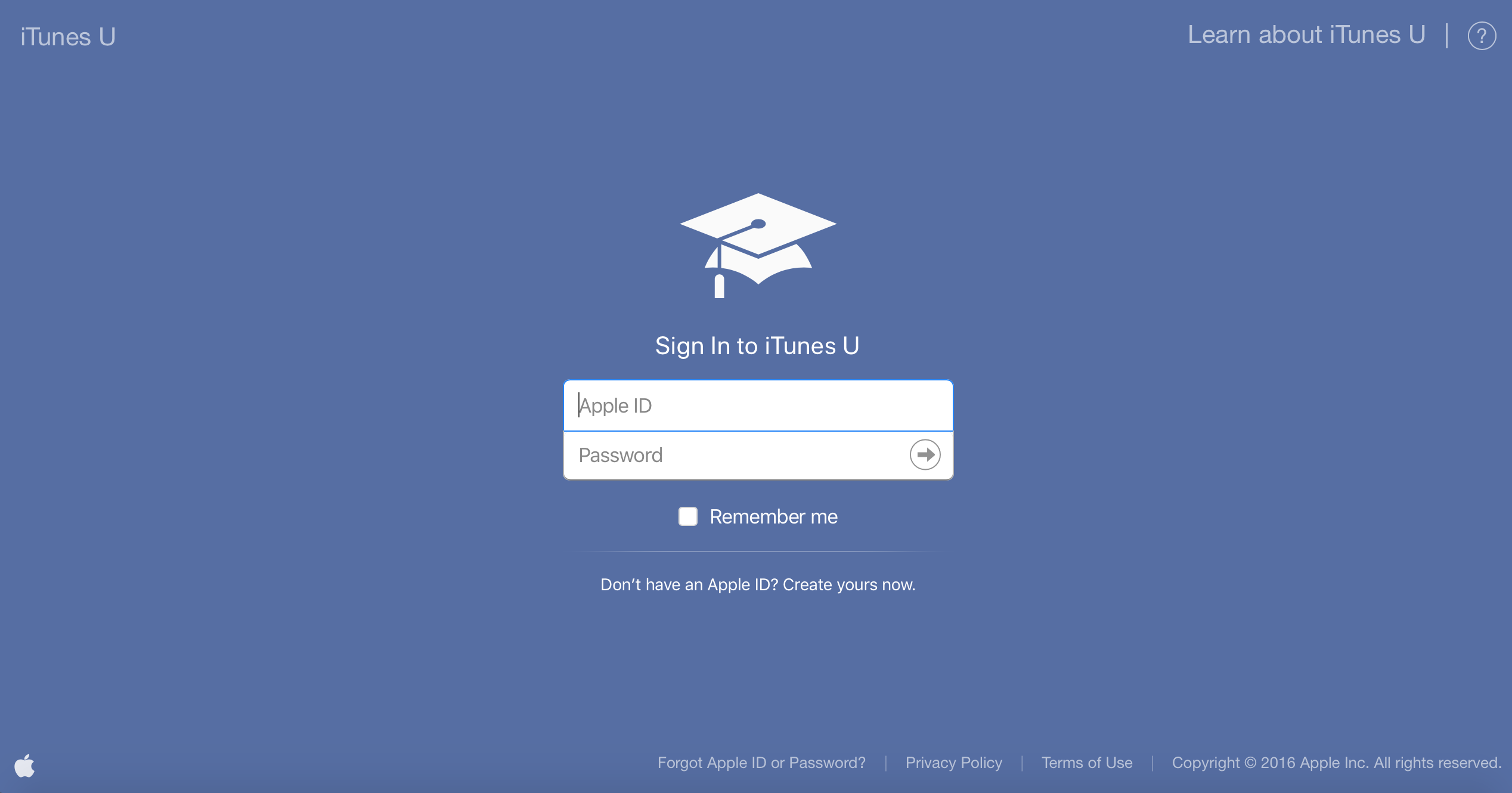 Do zalogowania się w iTunes U i tworzenia kursów, podobnie jak do pobrania aplikacji z AppStore’a, potrzebne jest Apple ID, które jest naszym identyfikatorem na urządzeniach „jabłuszkowych”, dla czynności związanych z zakupami aplikacji bądź obsługą urządzeń.