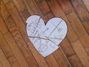 Każdy zespół otrzymuje jedne pocięte puzzle (zał. 3.1- 3.5). Na umówiony sygnał zespół układa je tak, by po ułożeniu całości poszczególne elementy tworzyły kształt serca.
