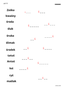4) Kiedy już uczniowie poznają wszystkie spółgłoski miękkie, należy wykonać serię ćwiczeń w których spółgłoski miękkie będą znajdowały się na końcu wyrazu. Także i w tym przypadku należy pamiętać by angażowały percepcję słuchową, wzrokową oraz ruchową, pamięć oraz orientację czasowo-przestrzenną.