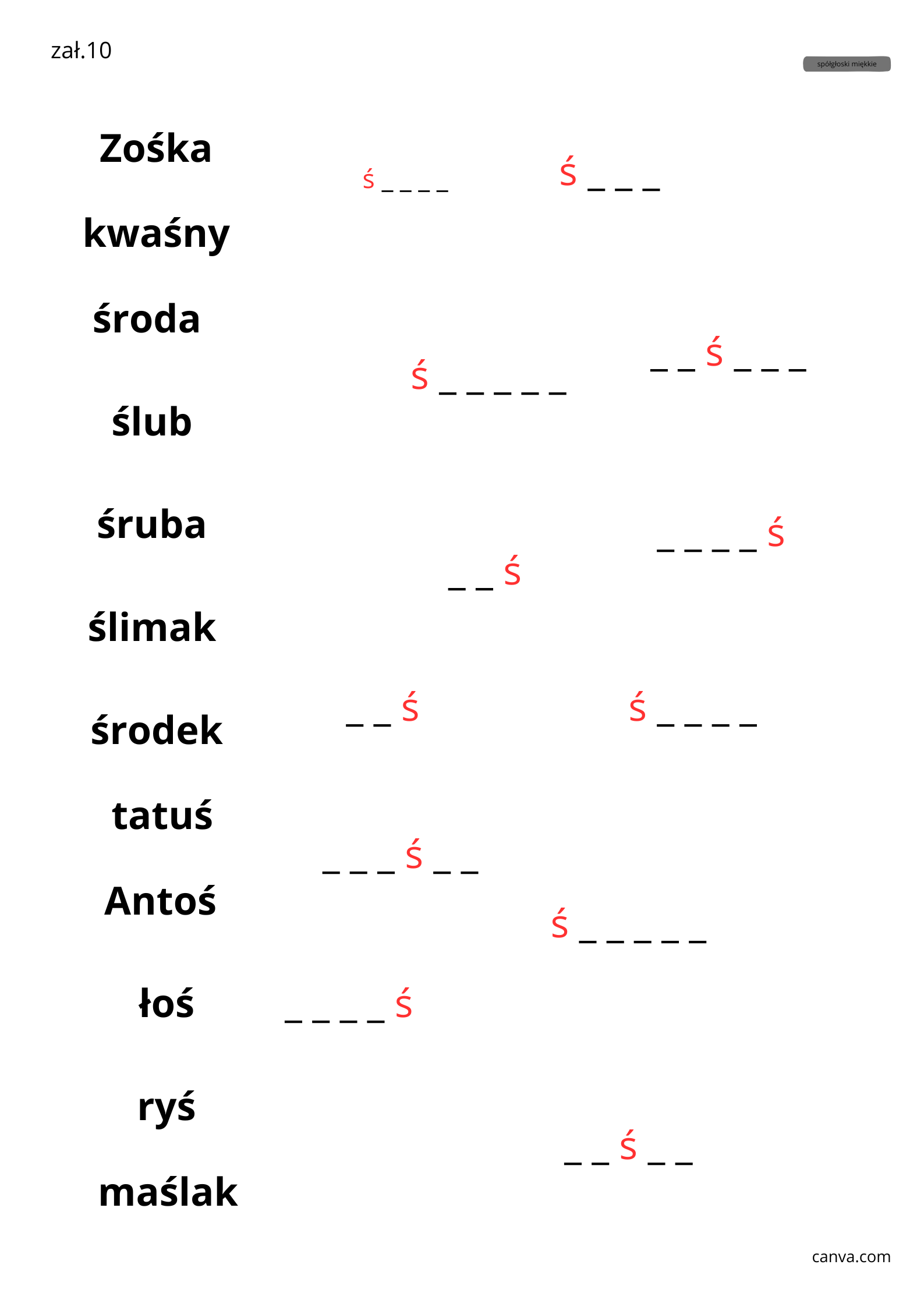 -ś: w nagłosie: środa, ślub, śruba, ślimak, środek; w wygłosie: tatuś, Antoś, łoś, ryś; w śródgłosie: maślak, Zośka, kwaśny,